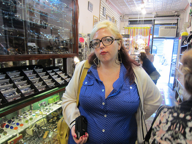 Fabulous Fanny’s stocks lots of brand new vintage replicas and never worn actual vintage glasses. Even better, they rhinestone some of them. All of the glasses I’ve owned for the past eight years came from there and I get compliments all the time. It helps if you go in knowing what you’re looking for, they can lead you right to it in their drawers upon drawers of stock, or just play around with your friends and find the frames that work for you.
