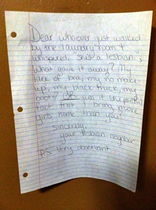 Lesbian pens clever response to homophobic neighbor https://www.lesbian.com/lesbian-pens-clever-response-to-homophobic-neighbor/ https://www.lesbian.com/lesbian-pens-clever-response-to-homophobic-neighbor/#respond Thu, 16 Jan 2014 18:45:30 +0000 http://www.lesbian.com/?p=19705 Woman tapes note on neighbor's door after hearing derogatory comment.